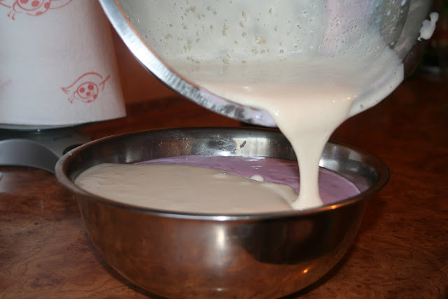 Hokus pokus czary mary fioletowy kolor stał się białym (za dużo mleka dodałyśmy). Na koniec 'oblewamy' wcześniej przygotowaną czekoladą (nie jest to obowiązkowe, można zostawić 'surową' pianką lub wypróbować swoją koncepcję na dodatek lub dekorację.